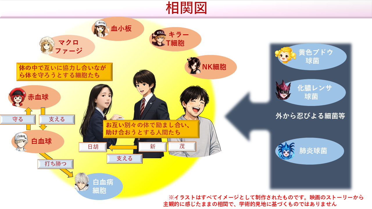 どちらも体を守るために毎日働いているんだけど、その姿が役者さんによって擬人化されると、まるで双方が対立したりはり合ったりしているみたいに見える瞬間があった。
