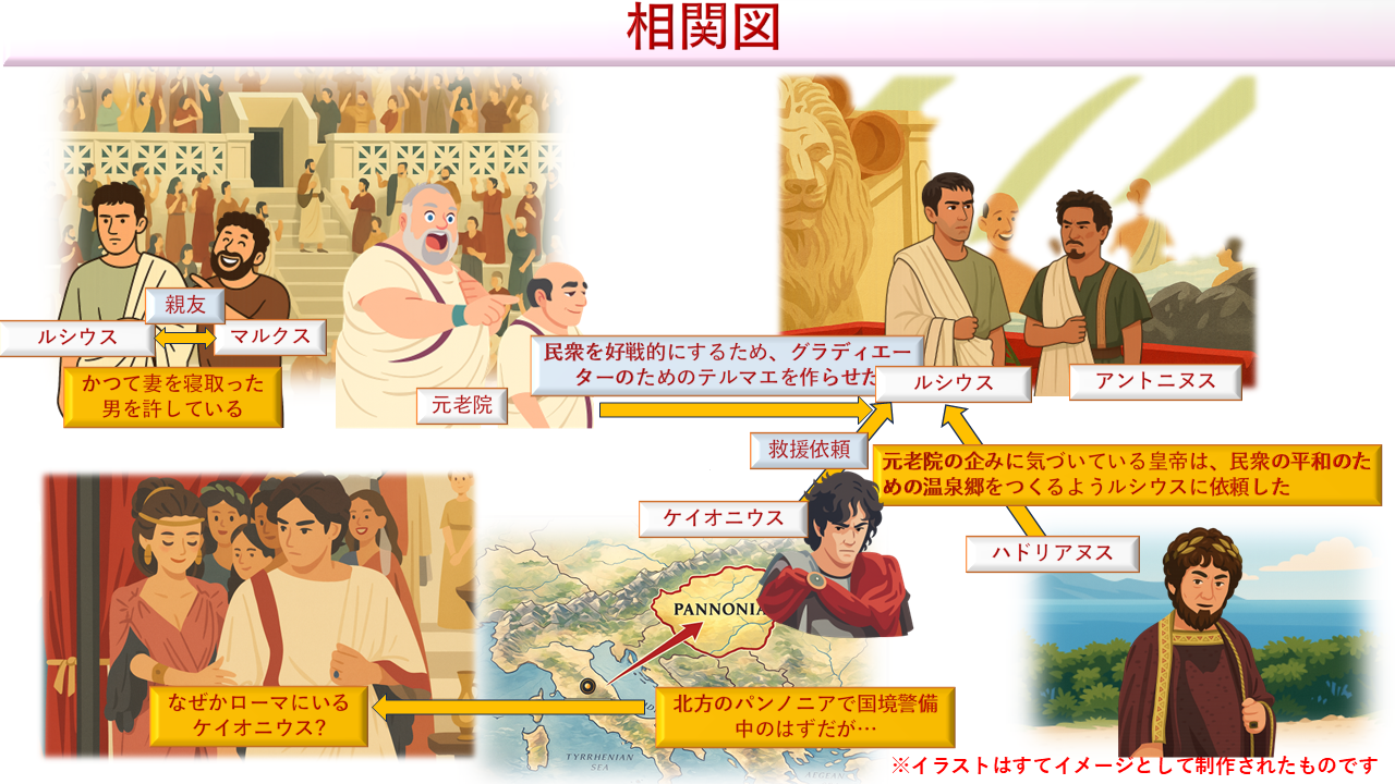 相関図①|ローマのテルマエ技師ルシウスと“戦いを望む勢力”元老院