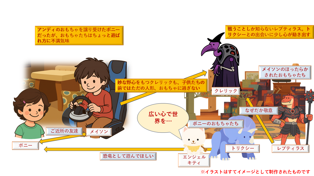 そんな彼の姿を目の当たりにしたトリクシーは、何とかして彼らを救わなければと感じたのだと思うわ。トリクシー自身も恐竜として遊んでもらえないことに悩んでいた。でも、だからこそ「遊びを知らない悲しさ」を抱えるレプティラスに寄り添える気持ちが芽生えたのかもしれないの。
